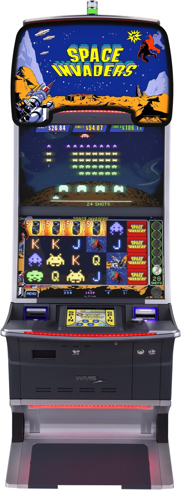 The six-reel, 60-line slot game features a number of bonuses including free games and the Space Invaders Bonus, allowing players to control a laser cannon – moving it horizontally across the bottom of the screen while trying to shoot down rows of descending aliens, collecting credits, advancing levels and vying for one of the multi-level Jackpot Pools.